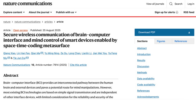 近日,我院设计科学系牛亚峰教授团队与东南大学毫米波全国重点实验室崔铁军院士团队、北京大学李廉林教授团队合作,提出了一种深度融合脑机接口视觉刺激编码与超表面时空编码的策略,实现了人脑和外部设备之间可靠安全的信息传输与大脑控制,所提出的无线脑机接口方案可以为人机交互和智能超表面建立一个安全的脑机工作范式。相关研究工作以题为“Secure wireless communication of brain–computer interface and mind control of smart devices enabled by space-time-coding metasurface”的论文,于2025年8月25日发表在国际知名期刊《Nature Communications》上。牛亚峰教授为论文共同通讯作者,设计学博士生范林涵为共同第一作者。